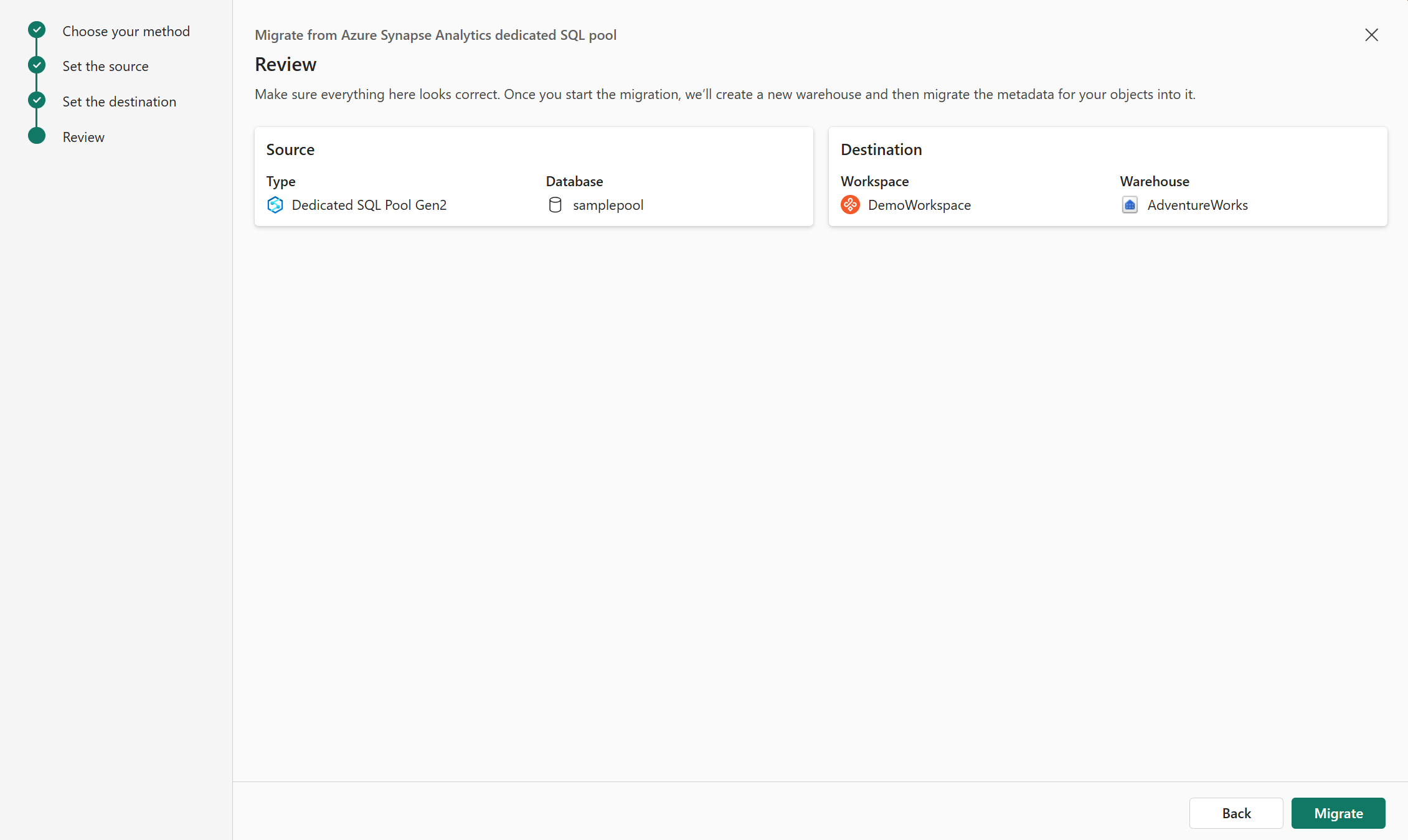 이 가이드에서는 원본 시스템에 연결하여 Azure Synapse Analytics 전용 SQL 풀 또는 SQL Server 데이터베이스에서 패브릭 웨어하우스로 마이그레이션하는 단계를 안내합니다.