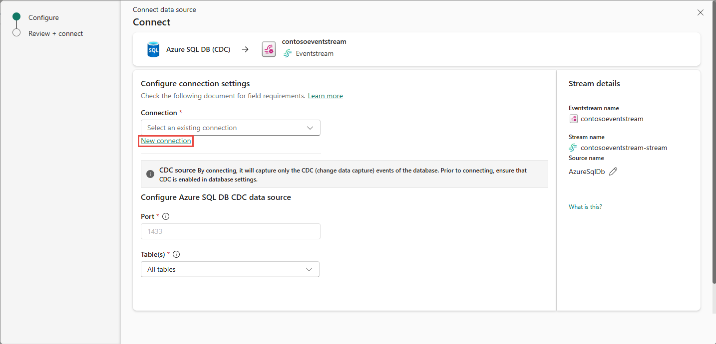 연결 페이지에서 Eventstream 또는 Real-Time 허브를 사용하는지 여부에 따라 다음 단계 중 하나를 수행합니다.