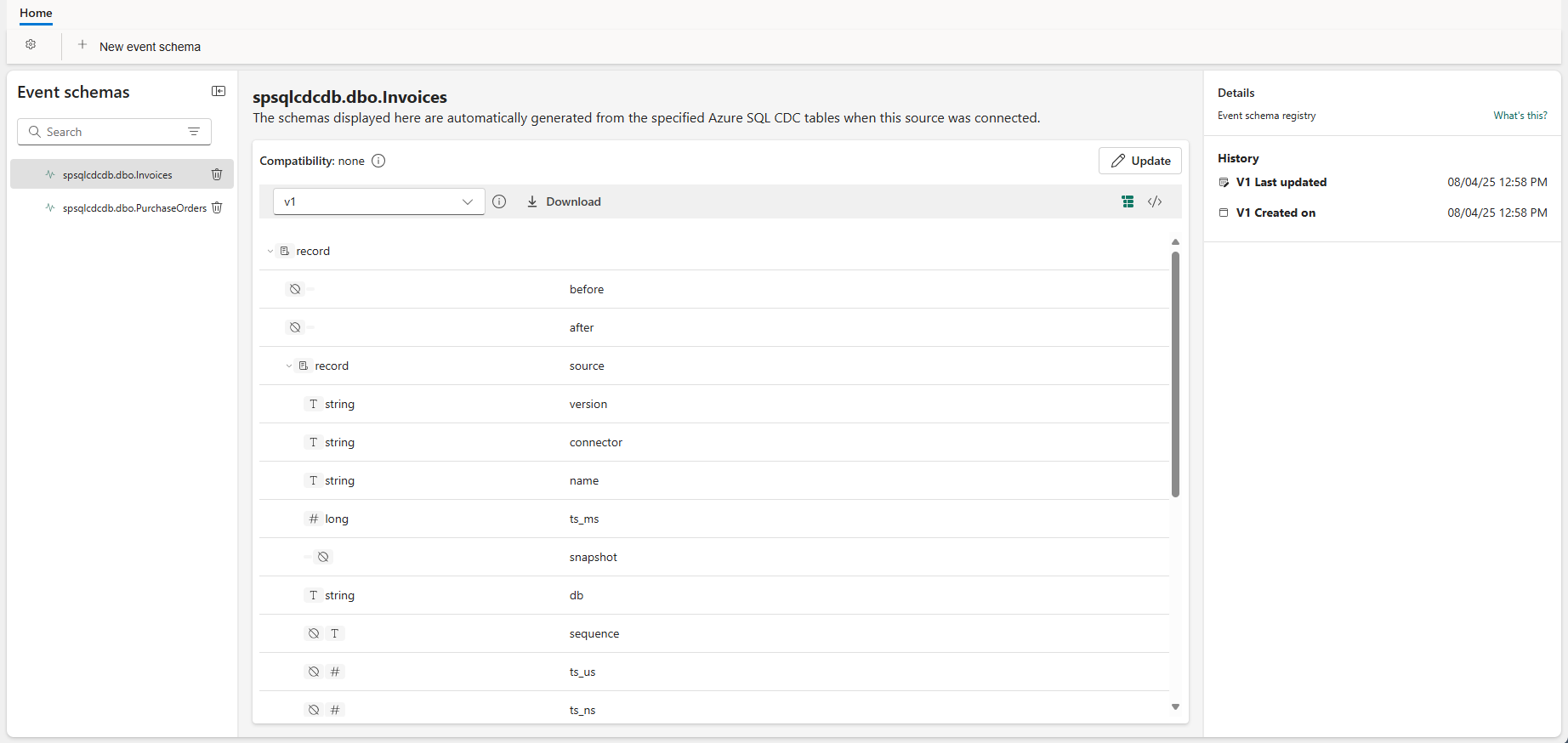 Azure SQL Database(CDC) 커넥터가 만든 스키마 집합을 선택합니다.