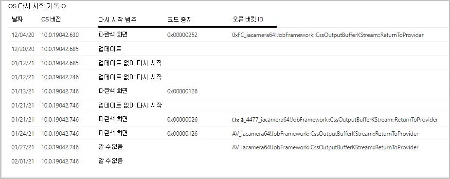 OS 다시 시작 기록 테이블에는 지난 30일 이내에 발생한 10개의 가장 최근 다시 시작이 표시됩니다. 이 테이블은 짧은 대기 시간으로 업데이트되므로 일반적으로 디바이스 성능 탭의 일일 집계에 표시되기 전에 새 다시 시작이 여기에 표시됩니다.