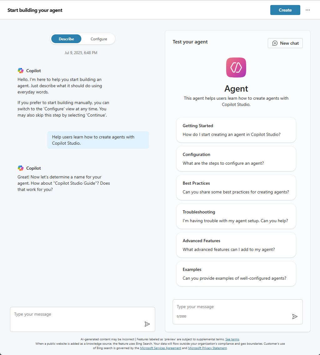 테스트 창에서 에이전트와 채팅합니다. 사용자 고유의 질문을 입력하거나 제안된 프롬프트 중 하나를 시도해 보세요. 필요에 따라 테스트 창과 만들기 창 간에 앞뒤로 이동하여 에이전트를 추가로 구체화합니다. 제안된 프롬프트를 다시 보려면 테스트 창 위쪽에서 새 채팅 을 선택합니다.