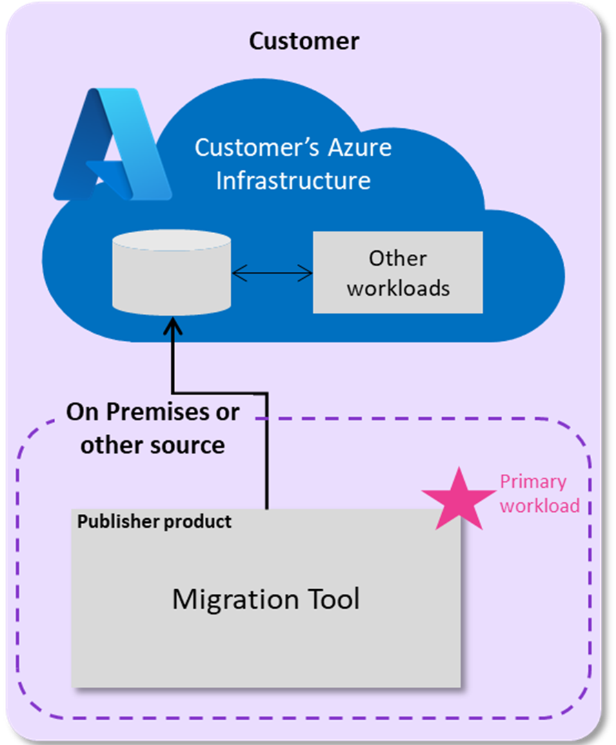 고객의 Azure 인프라와 ISV 게시자가 제공하는 마이그레이션 도구를 보여 주는 다이어그램입니다. 이 마이그레이션 도구는 자체 데이터 센터나 다른 소스에 배포될 수 있습니다.