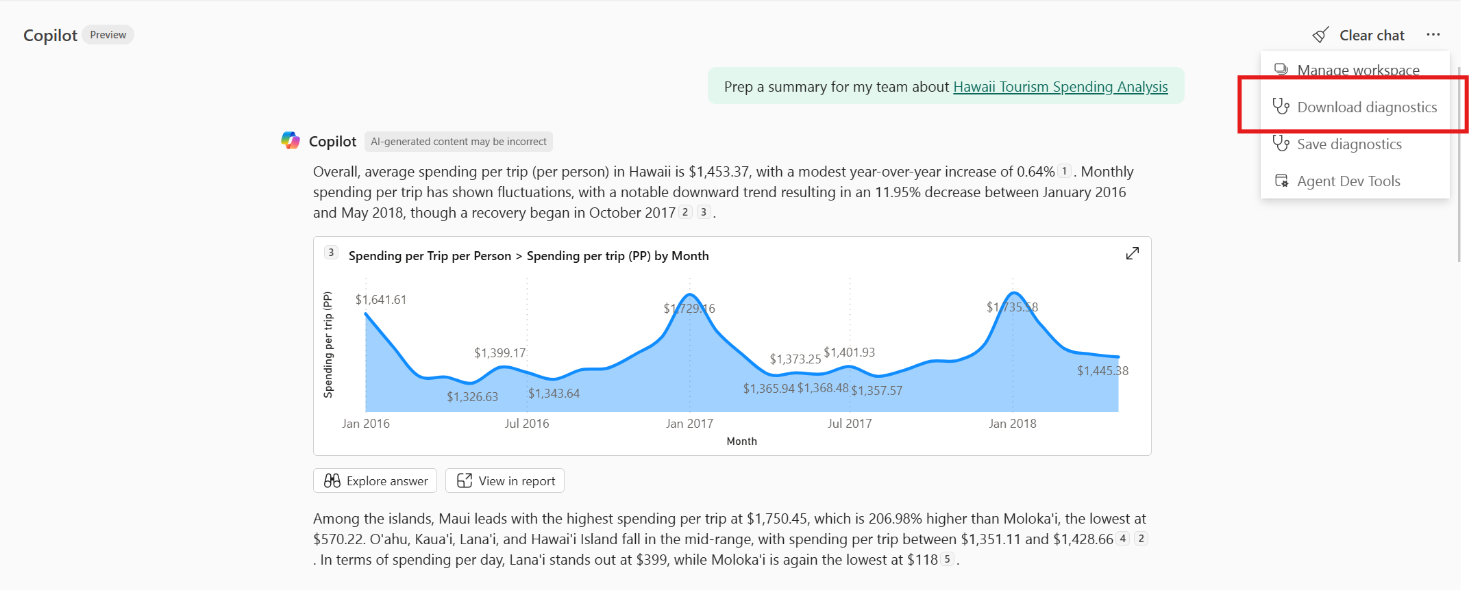 보고서 요약 또는 답변이 예상보다 오래 걸리는 경우 사용 중인 시각적 개체와 쿼리하는 데 걸리는 시간을 확인할 수 있습니다. 즉, 질문에 대답하는 데 중요한 시각적 개체를 로드하는 데 시간이 오래 걸리는 경우 시각적 개체를 더 작은 조각으로 분할하여 더 빠르게 Copilot만들 수 있습니다. 또한 사용하기에 Copilot 중요하지 않은 경우 장기 실행 쿼리 시간 시각적 개체를 제거할 수 있습니다. 줄임표 메뉴에서 사용할 수 있는 진단에서 이 정보를 볼 수 있습니다.