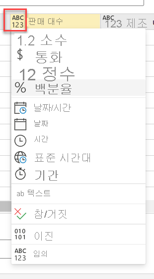 상황에 맞는 메뉴를 사용하여 열을 추가 및 제거할 수 있습니다. 붙여넣은 데이터에 머리글 행이 포함된 경우 첫 번째 행을 머리글로 사용을 선택하여 첫 번째 행을 머리글 행으로 자동으로 승격합니다. Power BI는 자동으로 데이터 형식을 검색하지만 사용자가 수동으로 설정할 수도 있습니다. 열 이름 옆에 있는 데이터 형식 단추를 선택합니다.