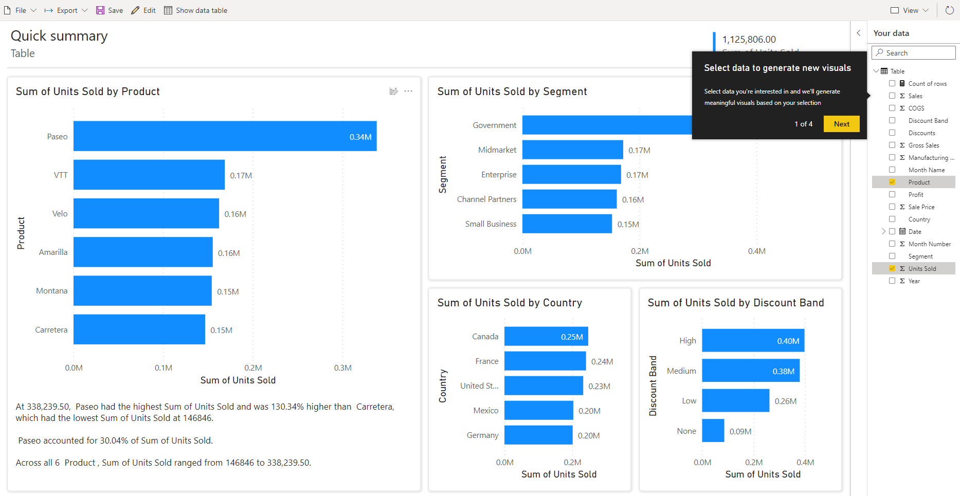 만들기 프로세스를 진행하는 동안 Power BI는 새 의미 체계 모델을 만들고 요약된 데이터 보기를 자동으로 생성합니다. 이러한 자동 생성된 시각적 개체를 통해 원시 데이터에서 그 어느 때보다 빠르게 인사이트를 얻을 수 있습니다.