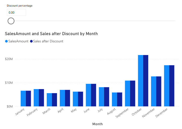 Sales after Discount = SUM(Sales[SalesAmount]) - (SUM(Sales[SalesAmount]) * 'Discount percentage' [Discount percentage Value])이 수식은 할인 후 Sales라는 측정값을 만듭니다.