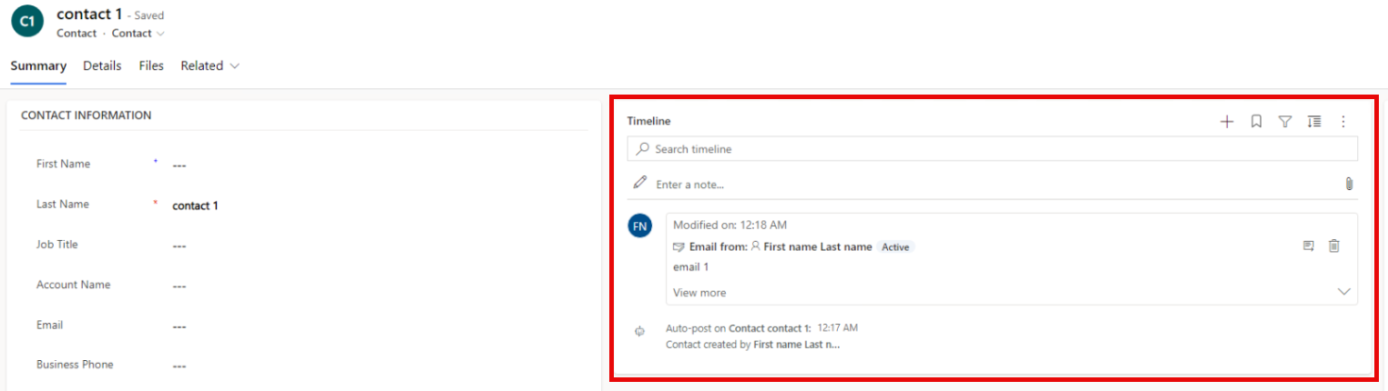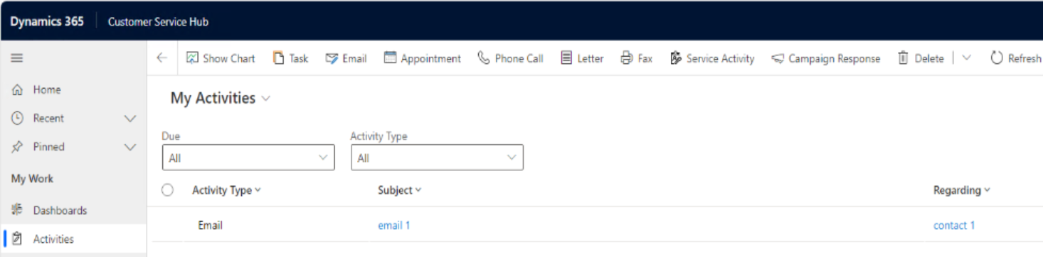 활동 보기와 타임라인 월은 활동 포인터 데이터가 표시되는 일반적인 위치입니다. ActivityPointerBase 테이블에서 데이터를 삭제하면 이러한 보기에 데이터가 표시되지 않습니다. 예를 들어, 다음 이미지를 확인해 보세요.
