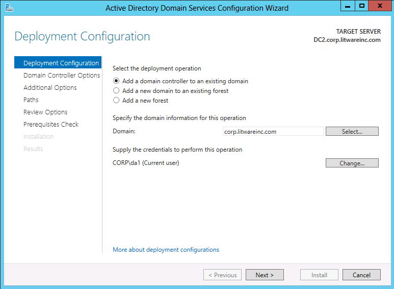 Server Manager prompts you for valid credentials if needed. Installing an additional domain controller requires membership in the Domain Admins group.