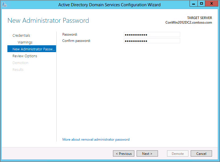 The New Administrator Password page requires you to provide a password for the built-in local computer’s Administrator account, once the demotion completes and the computer becomes a domain member server or workgroup computer.