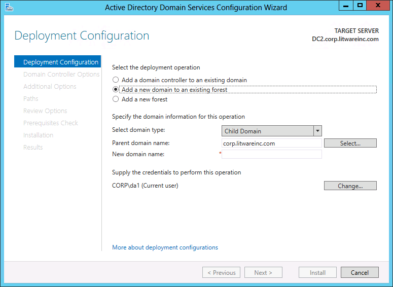 For more information about how to create a domain, see Install a New Windows Server 2012 Active Directory Child or Tree Domain (Level 200). For more information about how to add a domain controller to an existing domain, see Install a Replica Windows Server 2012 Domain Controller in an Existing Domain (Level 200).