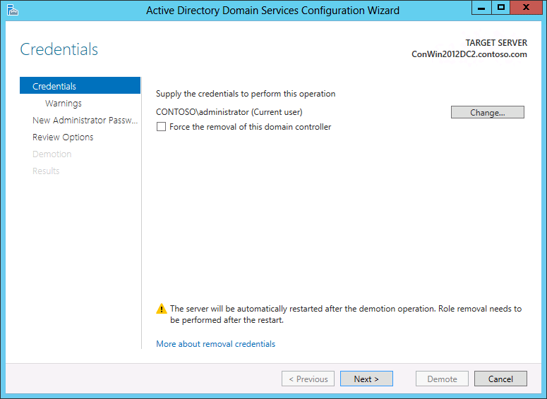 Demoting an additional domain controller requires Domain Admin credentials. Selecting Force removal of the domain controller demotes the domain controller without removing the domain controller object’s metadata from Active Directory.