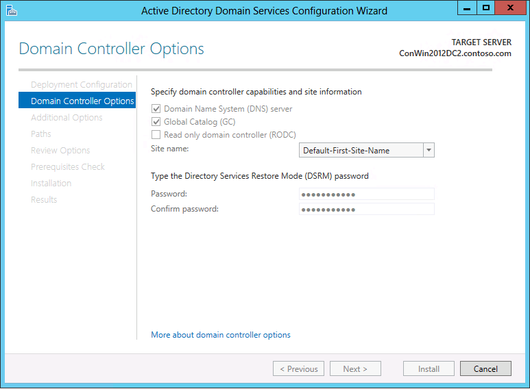 If you are adding a domain controller to a domain, the Domain Controller Options page has these options: