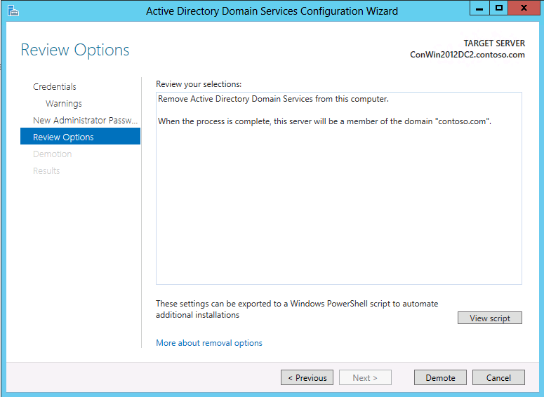 The Review Options page provides you the chance to export the configuration settings for demotion to a Windows PowerShell script so you can automate additional demotions. Click Demote to remove AD DS.
