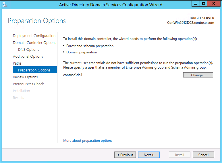 Server Manager begins every domain controller installation with the Deployment Configuration page. The remaining options and required fields change on this page and subsequent pages, depending on which deployment operation you select. For example, if you create a new forest, the Preparation Options page does not appear, but it does if you install the first domain controller that runs Windows Server 2012 in an existing forest or domain.