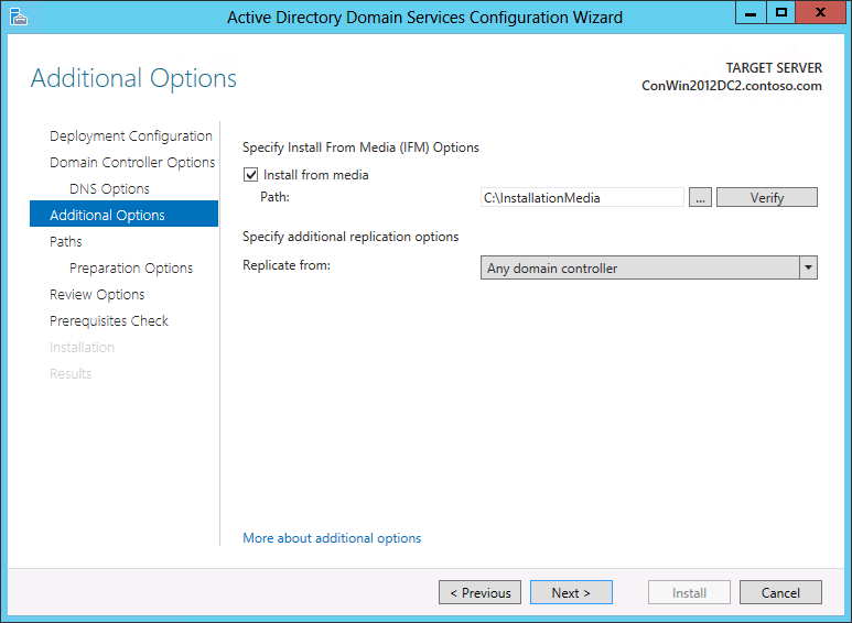 You can also choose to install the domain controller using backed up media using the Install from media (IFM) option. If the installation media is stored locally, the Install from media Path option allows you to browse to the file location. The browse option is not available for a remote installation. You can click Verify to ensure the provided path is valid media. Media used by the IFM option must be created with Windows Server Backup or Ntdsutil.exe from another existing Windows Server 2012 computer only; you cannot use a Windows Server 2008 R2 or previous operating system to create media for a Windows Server 2012 domain controller. If the media is protected with a SYSKEY, Server Manager prompts for the image's password during verification.