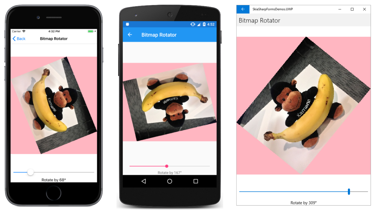 ValueChanged 처리 Slider 기는 회전 각도에 따라 새로 rotatedBitmap 만드는 작업을 수행합니다. 새 너비와 높이는 원래 너비와 높이의 사인과 코사인의 절대값을 기반으로 합니다. 회전된 비트맵에서 원래 비트맵을 그리는 데 사용되는 변환은 원래 비트맵 중심을 원점으로 이동한 다음 지정된 수만큼 회전한 다음 해당 중심을 회전된 비트맵의 중심으로 변환합니다. Translate(및 메서드는 적용되는 방식과 RotateDegrees 반대 순서로 호출됩니다.)