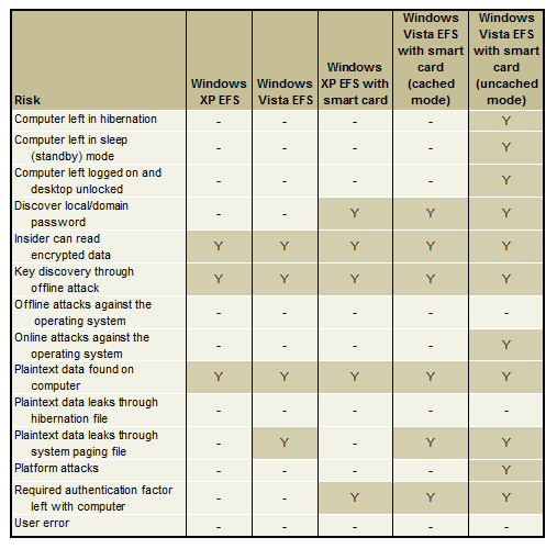 다음 표에서는 여러 가지 데이터 위험 및 다양한 EFS 옵션들이 각 위험을 어떻게 완화할 수 있는지를 보여줍니다. Windows XP 기반 컴퓨터의 경우 스마트 카드 로그온 필요 도메인 사용자 설정을 사용하도록 설정합니다. Windows Vista 기반 컴퓨터의 경우 EFS에 스마트 카드 필요 및 페이지 파일 암호화 사용과 같은 EFS 설정을 사용으로 설정합니다.
