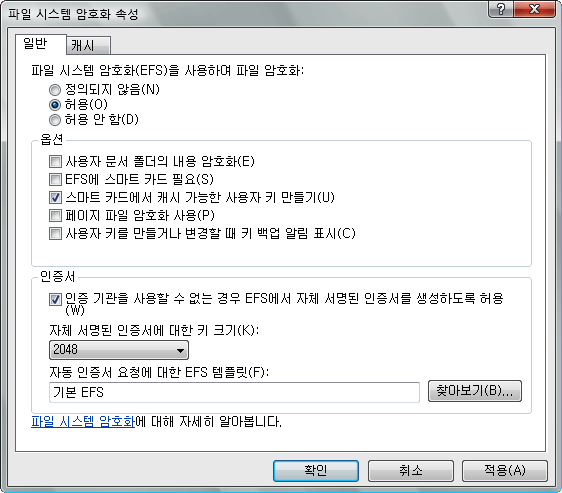 이 EFS 옵션은 Windows XP 또는 Windows Vista 기반 컴퓨터에서만 사용할 수 있습니다.