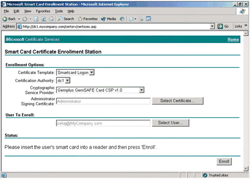 스마트 카드 솔루션을 사용하려면 Active Directory에서 계정 매핑을 수행할 수 있도록 PKI에서 공개 키/개인 키 쌍이 있는 인증서를 제공해야 합니다. 이 PKI는 다음 두 가지 방법 중 하나를 사용하여 구현할 수 있습니다. 외부 조직에 내부 인증서 인프라를 제공하거나 Windows Server 2003의 인증서 서비스를 사용합니다. 스마트 카드 솔루션에 Windows Server 2003의 인증서 서비스를 사용하려면 CA(인증 기관)가 엔터프라이즈 CA여야 하며 Active Directory가 필요합니다.