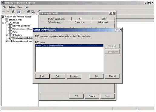 EAP 유형 목록에서 다음 스크린 샷에 표시된 스마트 카드 또는 다른 인증서 가 나타나지 않으면 추가 를 클릭하고 스마트 카드 또는 다른 인증서 를 선택한 다음 확인 을 클릭합니다.