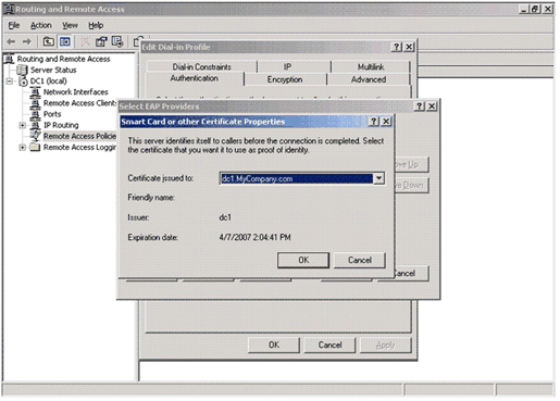 드롭다운 목록에서 EAP 인증에 사용할 인증서를 선택한 다음 확인 을 세 번 클릭합니다.