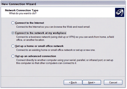 시작 을 클릭하고 연결 대상 , 모든 연결 표시 를 차례로 가리킨 다음 네트워크 작업 목록에서 새 연결 만들기 를 클릭합니다. 새 연결 마법사 시작 화면에서 다음 을 클릭합니다. 다음 화면이 표시됩니다.