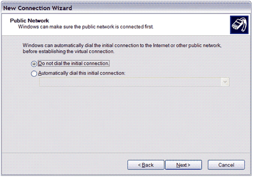 인터넷에 전용선으로 연결된 경우 초기 연결을 사용 안 함 을 선택하고 다음 을 클릭합니다. VPN을 만들기 전에 전화 접속으로 연결해야 할 경우에는 자동으로 이 초기 연결 사용 을 선택한 다음 드롭다운 목록에서 전화를 걸 연결을 선택하고 다음 을 클릭합니다.