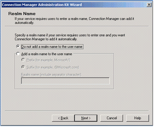 다음 스크린 샷에 표시된 영역 이름 화면에서 사용자 이름의 영역 이름을 추가할 수 있습니다. 사용자가 RADIUS를 사용하여 IAS(인터넷 인증 서비스) 서버에 네트워크 인증 자격 증명을 전송하는 타사 네트워크 액세스 서버를 통해 VPN에 연결할 경우 사용자를 확인하려면 영역 이름을 추가해야 합니다.