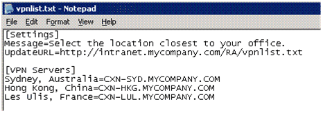 클라이언트에서 여러 VPN 서버에 연결하는 옵션을 사용하도록 하려면 다음 스크린 샷에 표시된 VPN 서버 목록을 텍스트 파일로 만듭니다. 연결할 때 VPN 서버 목록을 사용하려면 연결하기 전에 사용자가 VPN 서버를 선택할 수 있음 을 선택한 후 텍스트 파일을 찾고 다음 을 클릭합니다.
