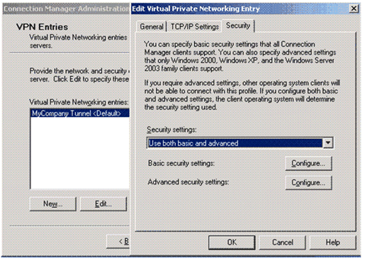 VPN 항목 화면에서 사용자가 만드는 프로필을 선택하고 편집 , 보안 탭을 차례로 클릭합니다. 다음 대화 상자가 표시됩니다.
