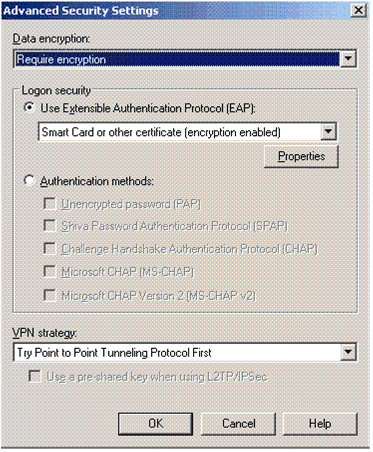 스마트 카드 액세스를 위한 VPN 서버 소프트웨어 요구 사항은 비교적 단순합니다. 원격 액세스 서버는 Windows 2000 Server 이상을 실행하고 라우팅 및 원격 액세스를 사용해야 하며 EAP-TLS(확장할 수 있는 인증 프로토콜-전송 계층 보안)를 지원해야 합니다.