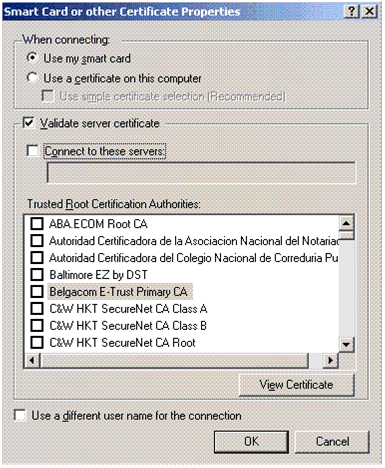 신뢰된 루트 인증 기관 상자에서 스마트 카드와 함께 사용할 인증서 또는 설치된 사용자 인증서를 발행한 CA의 이름을 클릭합니다.