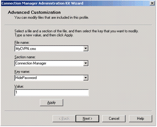 다음 스크린 샷에 표시된 고급 사용자 지정 화면에서는 프로필 구성 파일의 설정 값을 구성할 수 있습니다. 스마트 카드를 사용하는 VPN 연결에서는 전화 접속의 값을 0으로 설정하여 사용하지 않도록 해야 합니다. HideDomain, HideUserName 및 HidePassword 설정도 사용되었습니다.
