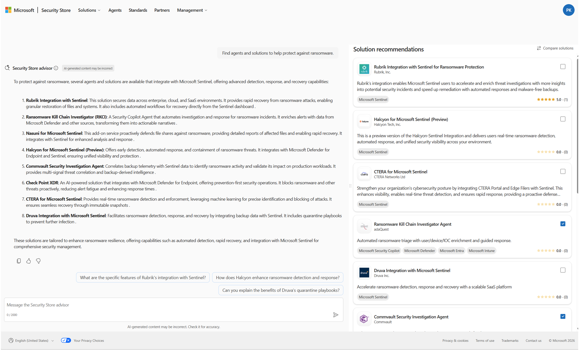 Security Store Advisor provides a guided, natural language experience that helps customers explore Microsoft and partner security solutions, agents, and services for their security outcomes. Users can describe the outcome they want to achieve such as strengthen identity protection or improve ransomware resilience and the Advisor returns relevant offerings aligned to that scenario.