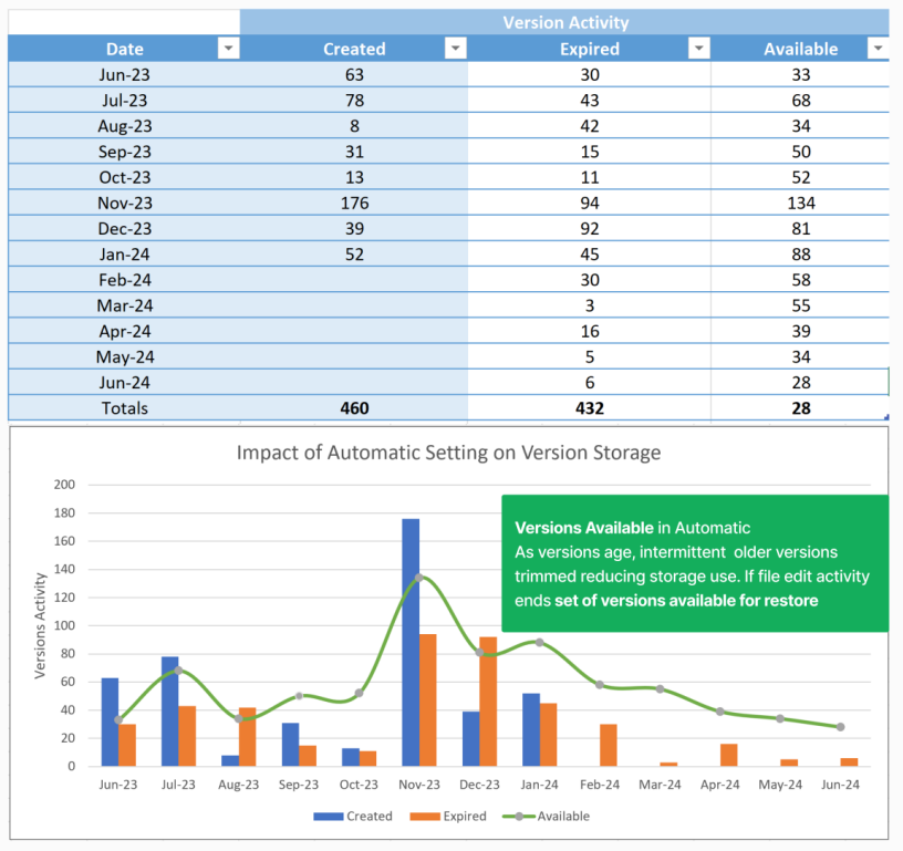 6월~1월 사이에 일관된 버전 생성 패턴이 있는 파일의 예를 들어보자. 자동 설정에서 간헐적 버전은 버전 사용 기간으로 제거되어 개수 제한만 적용하는 것에 비해 사용된 버전 스토리지가 최대 94% 감소합니다.