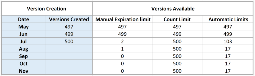5월, 6월 및 7월에 500개 버전이 만들어진 파일의 예를 들어보세요. 각 버전 제한에서 사용 가능한 버전을 비교해 보겠습니다.