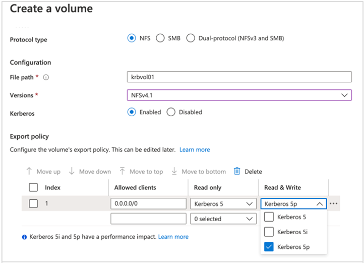 Kerberos 사용 클라이언트만 Kerberos를 지정하는 내보내기 규칙을 사용하여 볼륨에 액세스할 수 있습니다. Kerberos를 사용하는 경우 AUTH_SYS 액세스가 허용되지 않습니다.