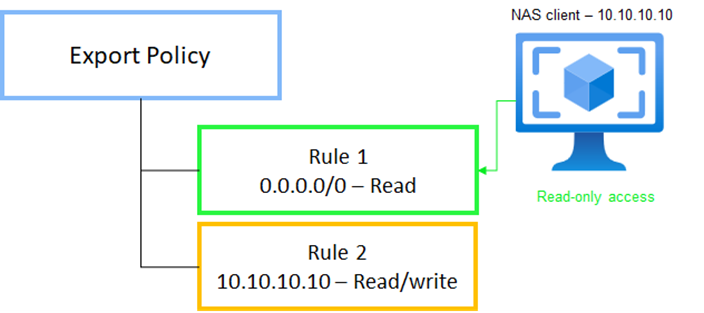 이 다이어그램은 서브넷 0.0.0.0/0(모든 서브넷의 모든 클라이언트)이 읽기 전용으로 설정되어 있고 정책에 첫 번째로 나열되기 때문에 볼륨에 대한 읽기 전용 액세스를 얻는 10.10.10.10의 IP를 가진 클라이언트를 보여줍니다.