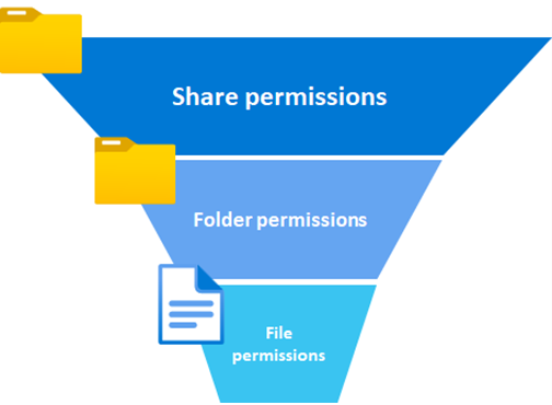 공유는 볼륨의 주요 진입점이며 가장 제한적인 권한은 다른 사용 권한을 재정의합니다. 공유 권한은 아래 이미지에 표시된 것처럼 깔때기 논리를 따라야 합니다. 즉, 공유는 기본 파일과 폴더보다 더 많은 액세스 권한을 허용합니다.