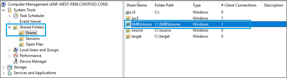 공유 수준 권한 ACL은 Azure NetApp Files가 아닌 Microsoft 관리 콘솔을 통해 관리됩니다. 이러한 ACL은 System Tools > 공유 폴더 > 공유에서 찾을 수 있습니다.