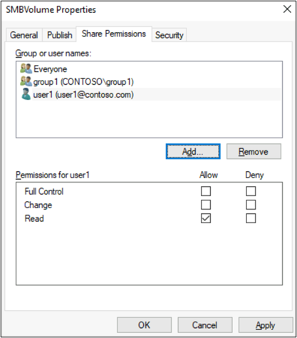 SMB 공유를 사용하면 최종 사용자가 Azure NetApp Files에서 SMB 또는 이중 프로토콜 볼륨에 액세스할 수 있습니다. SMB 공유는 공유를 탑재하고 액세스할 수 있는 사용자에 대한 액세스를 제어하고 Active Directory 도메인의 사용자 및 그룹에 대한 액세스 수준도 제어할 수 있습니다. 평가되는 첫 번째 권한 수준은 공유 ACL입니다.