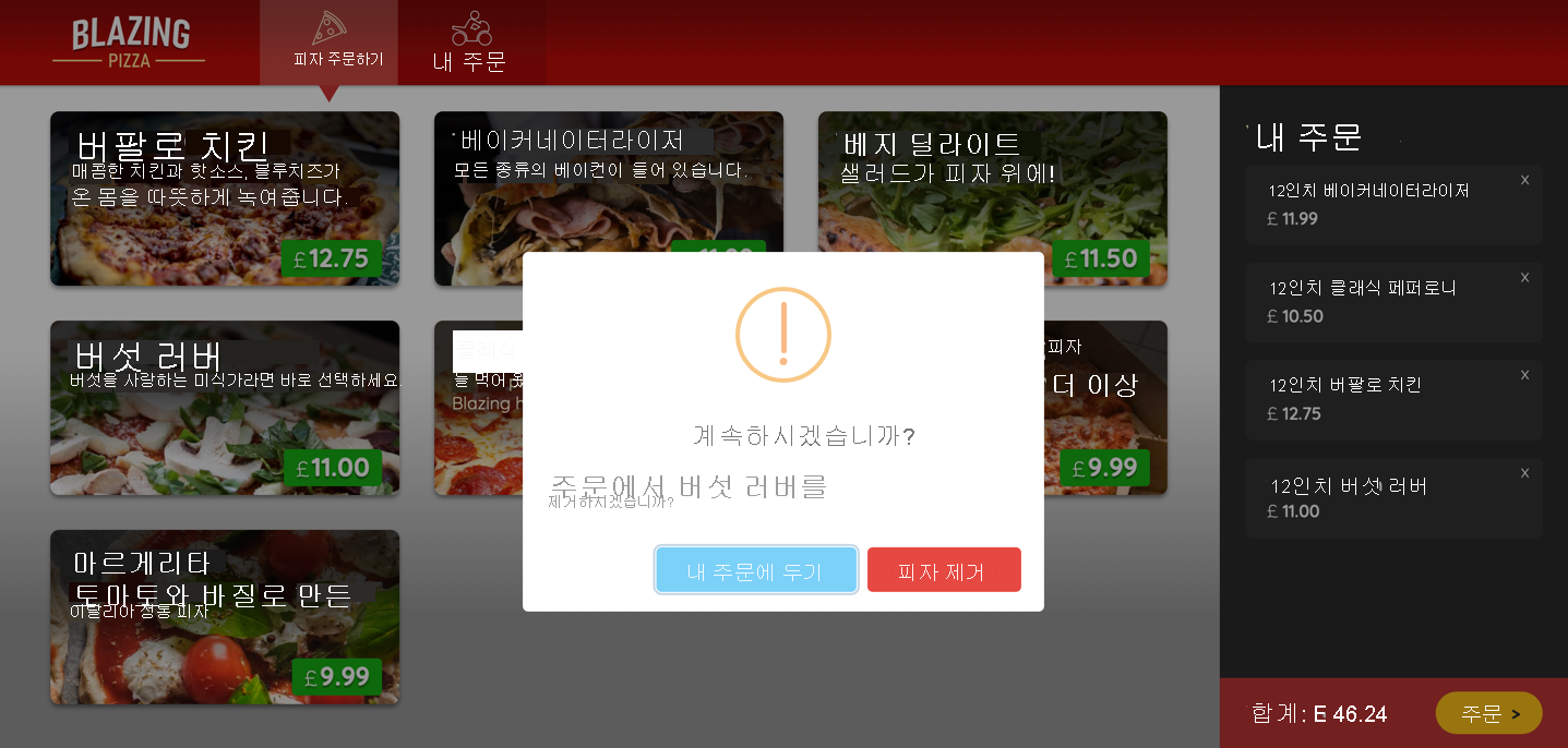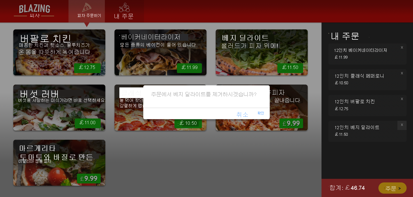 확인을 선택하고 피자가 주문에서 제거되었는지 확인합니다. 다른 피자 옆에 있는 X 를 선택하고 확인 대화 상자에서 취소 를 선택한 다음 피자가 주문에 남아 있는지 확인합니다.