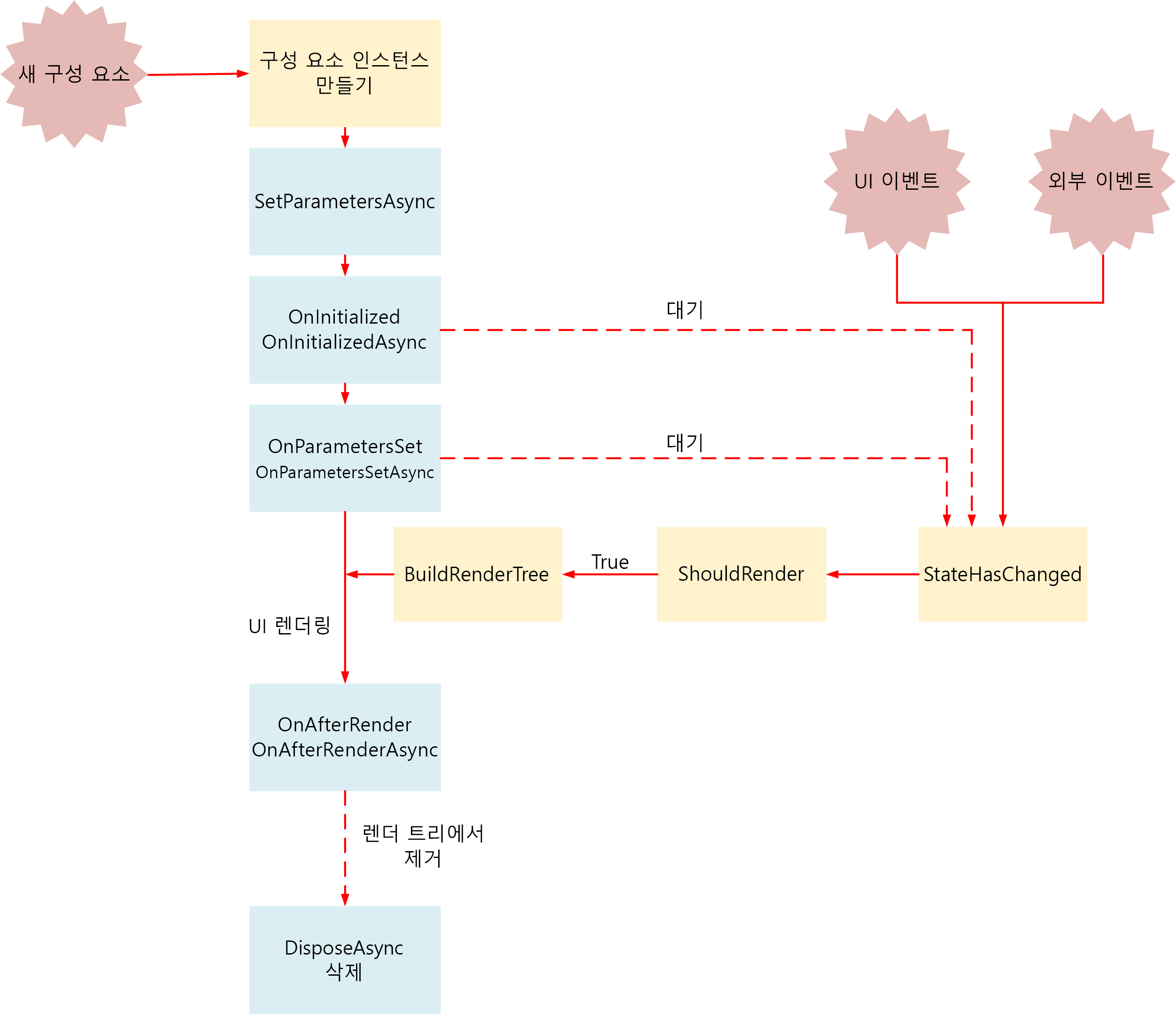 다음 다이어그램에서는 구성 요소의 수명 동안 발생하는 이벤트와 이러한 이벤트를 처리하는 데 사용할 수 있는 메서드를 보여줍니다. Blazor는 SetParametersAsync를 제외하고 각 메서드의 동기 및 비동기 버전을 둘 다 제공합니다.