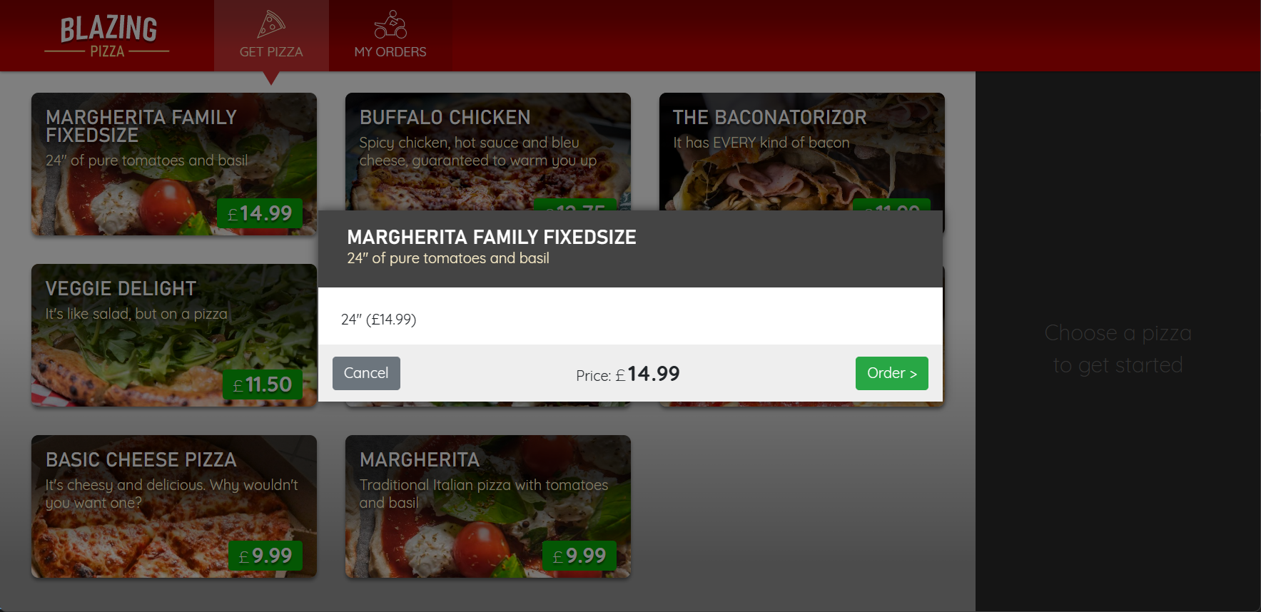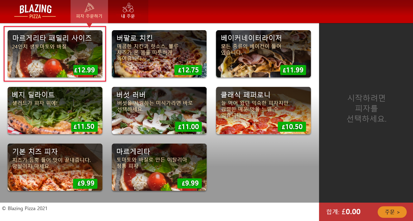 앱에서 새 Margherita Family Size 피자를 선택합니다.
