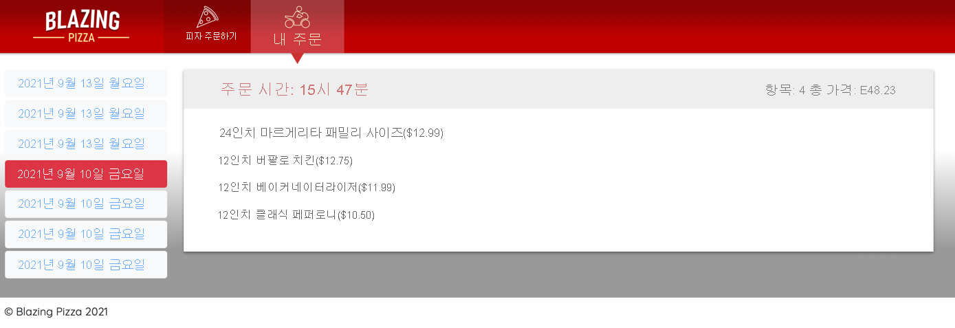 피자 회사는 내 주문 페이지에 주문한 피자 및 고객이 주문한 시간과 같은 과거 주문에 대한 자세한 정보를 고객에게 표시하려고 합니다.