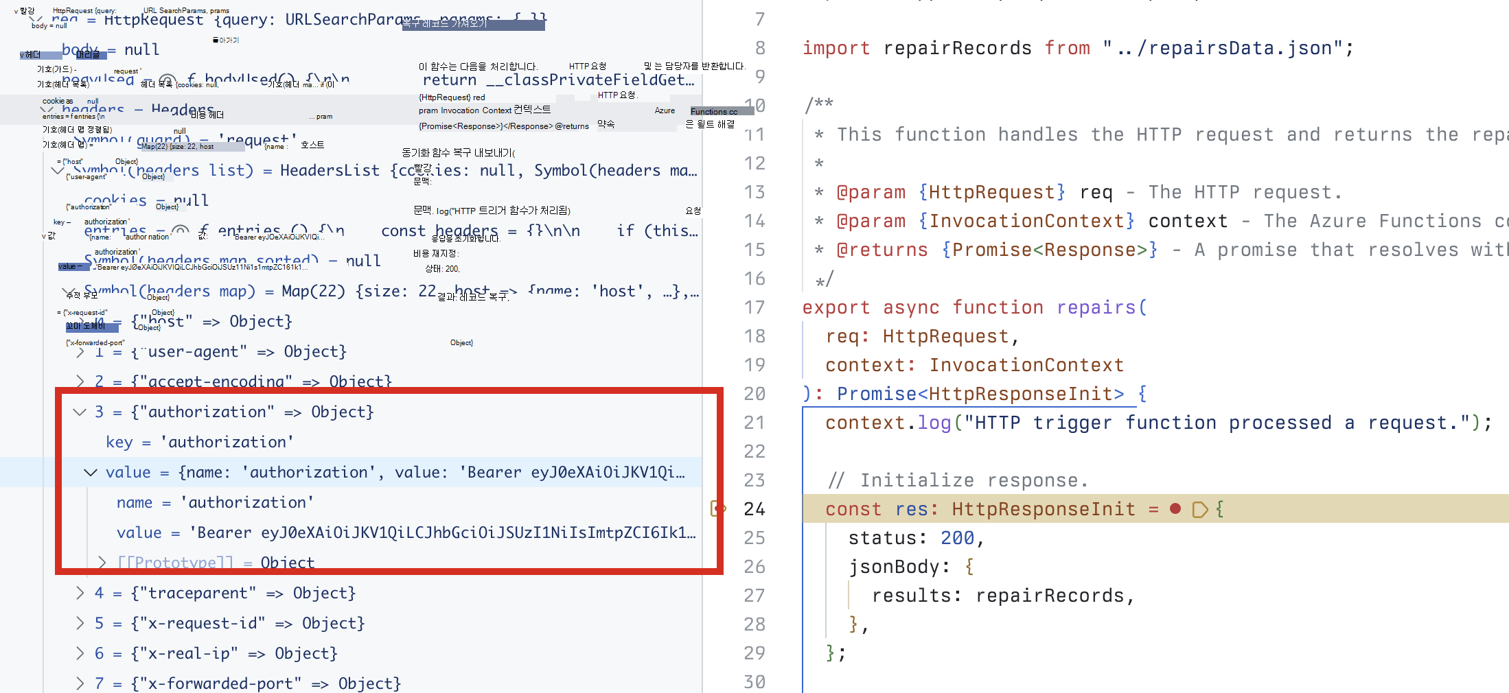 API는 로컬 컴퓨터에서 실행되므로 익명으로 액세스할 수 있지만 Microsoft 365 Copilot API 사양에 지정된 대로 인증된 API를 호출합니다. repairs 함수에서 중단점을 설정하고 선언적 에이전트에 다른 프롬프트를 제출하여 요청에 액세스 토큰이 포함되어 있는지 확인할 수 있습니다. 코드가 중단점에 도달하면 req.headers 컬렉션을 확장하고 JWT(JSON 웹 토큰)가 포함된 권한 부여 헤더를 찾습니다.