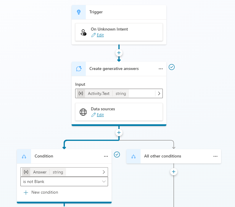 Select the the + icon under the Condition node, select Advanced, and select Generative answers.
