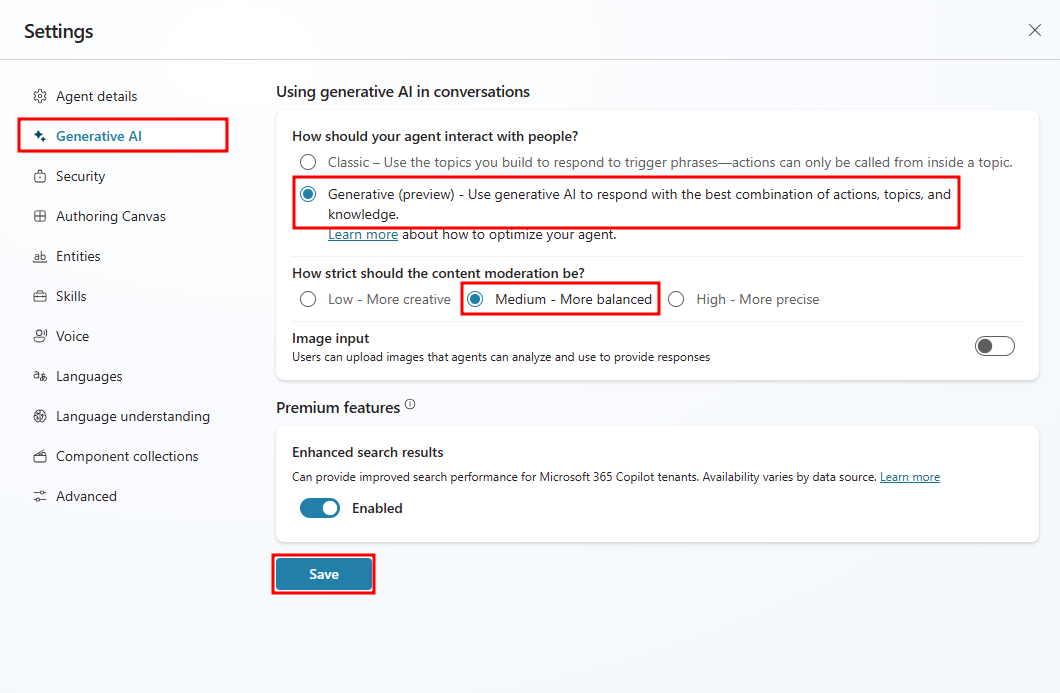 Select Generative under How should your agent decide how to respond.