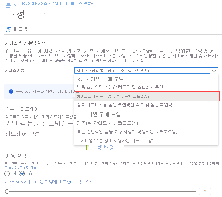 vCore 기반 구매 모델의 일부인 하이퍼스케일 서비스 계층은 범용 및 중요 비즈니스용 계층의 제한을 크게 초과하는 최신 및 가장 확장성 있는 옵션입니다.