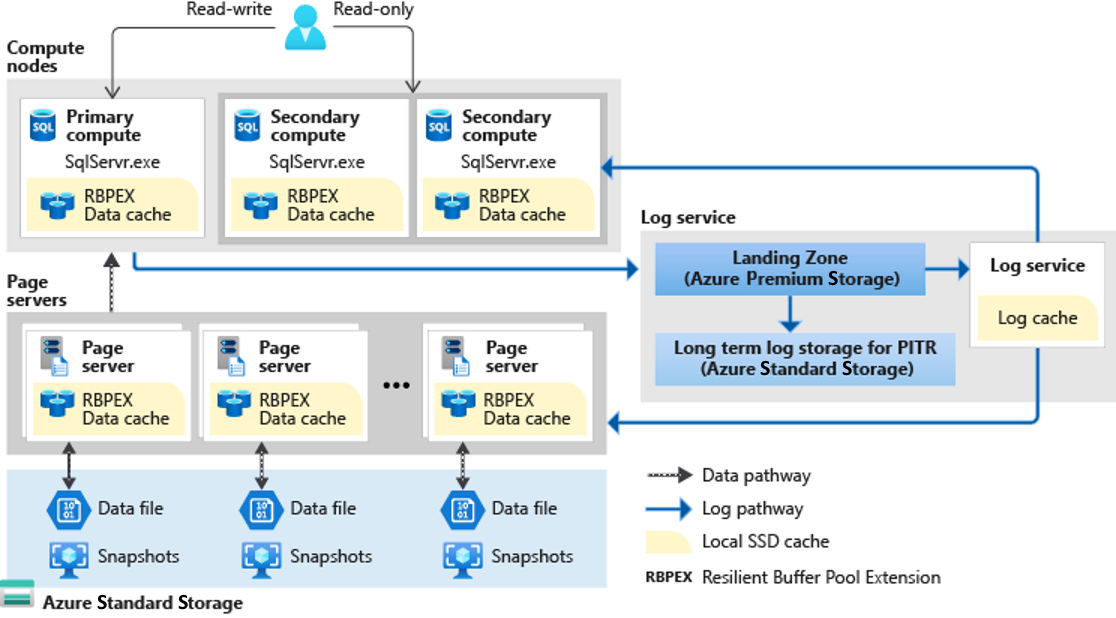 하이퍼스케일 서비스 계층은 Azure SQL Database에서만 사용할 수 있습니다. 이 서비스 계층에는 고유한 아키텍처가 있는데, 계층화된 캐시 계층과 페이지 서버를 사용하여 데이터 파일에 직접 액세스하지 않고도 빠르게 데이터베이스 페이지에 액세스하는 기능을 확장하기 때문입니다.
